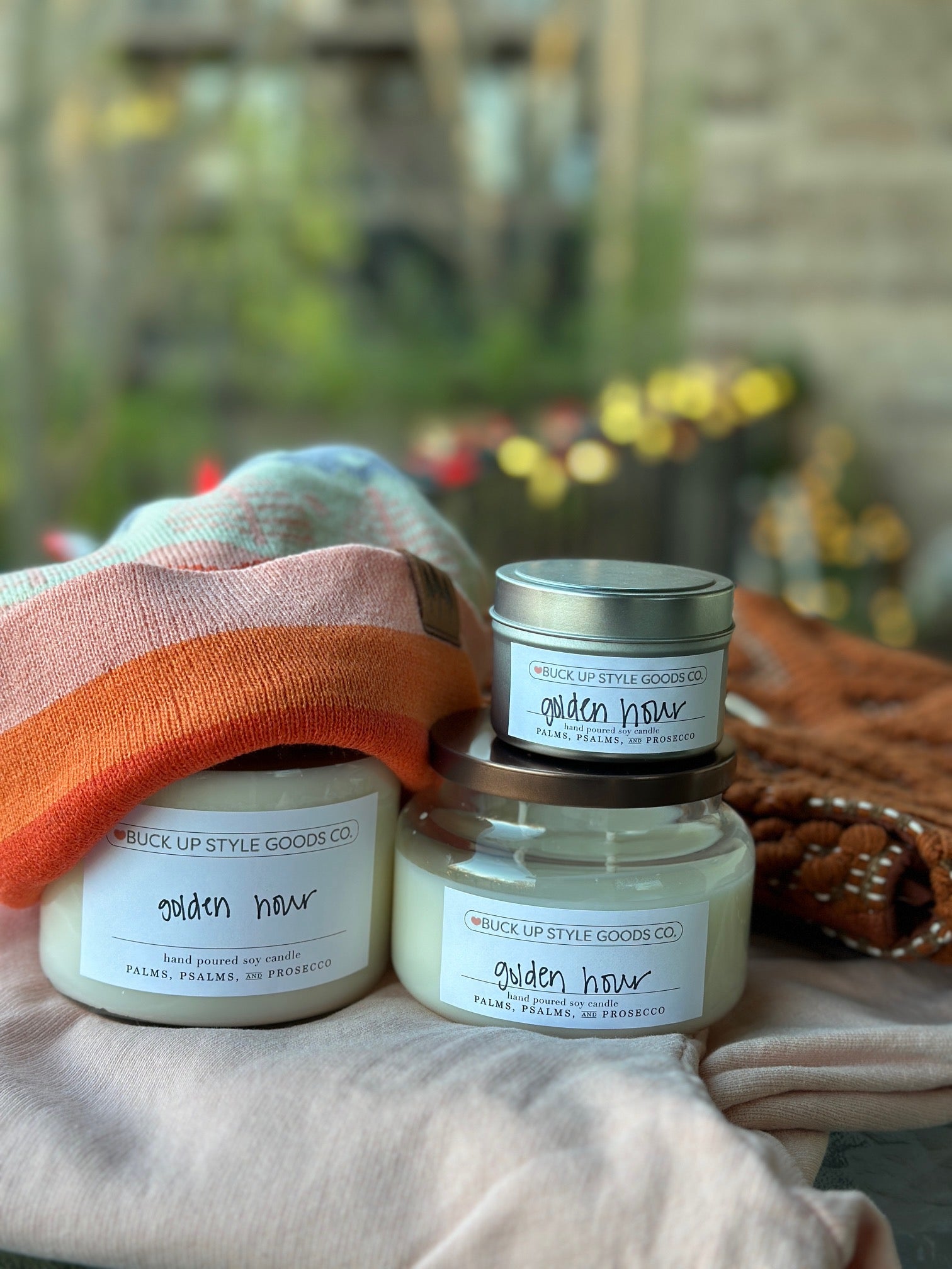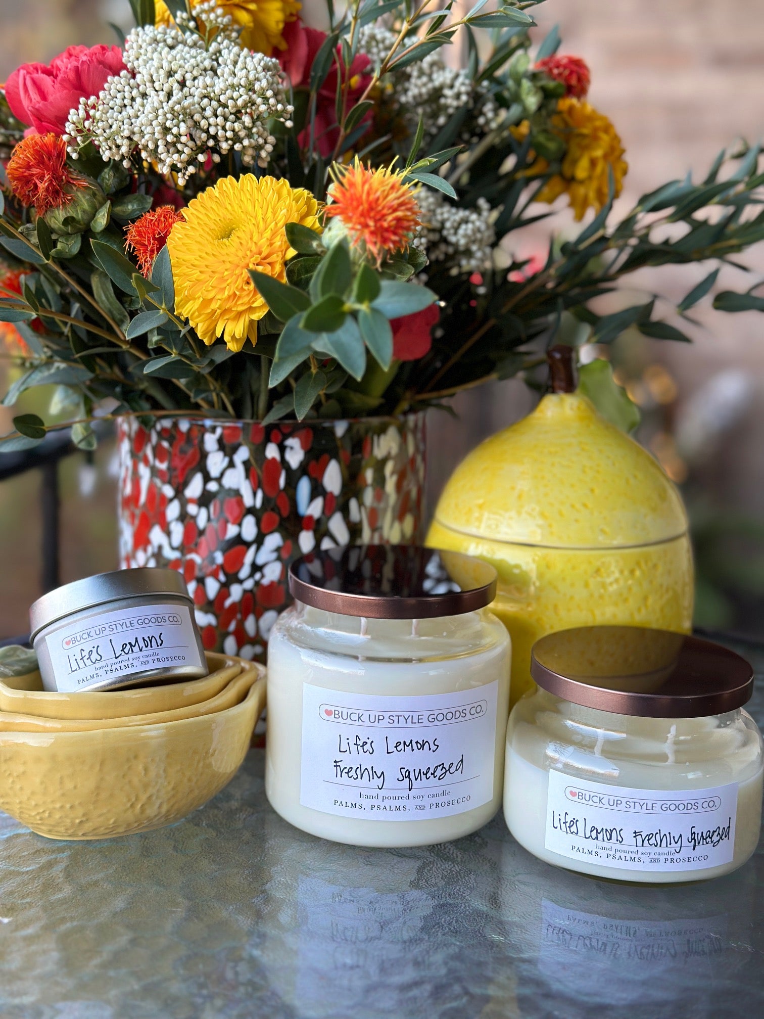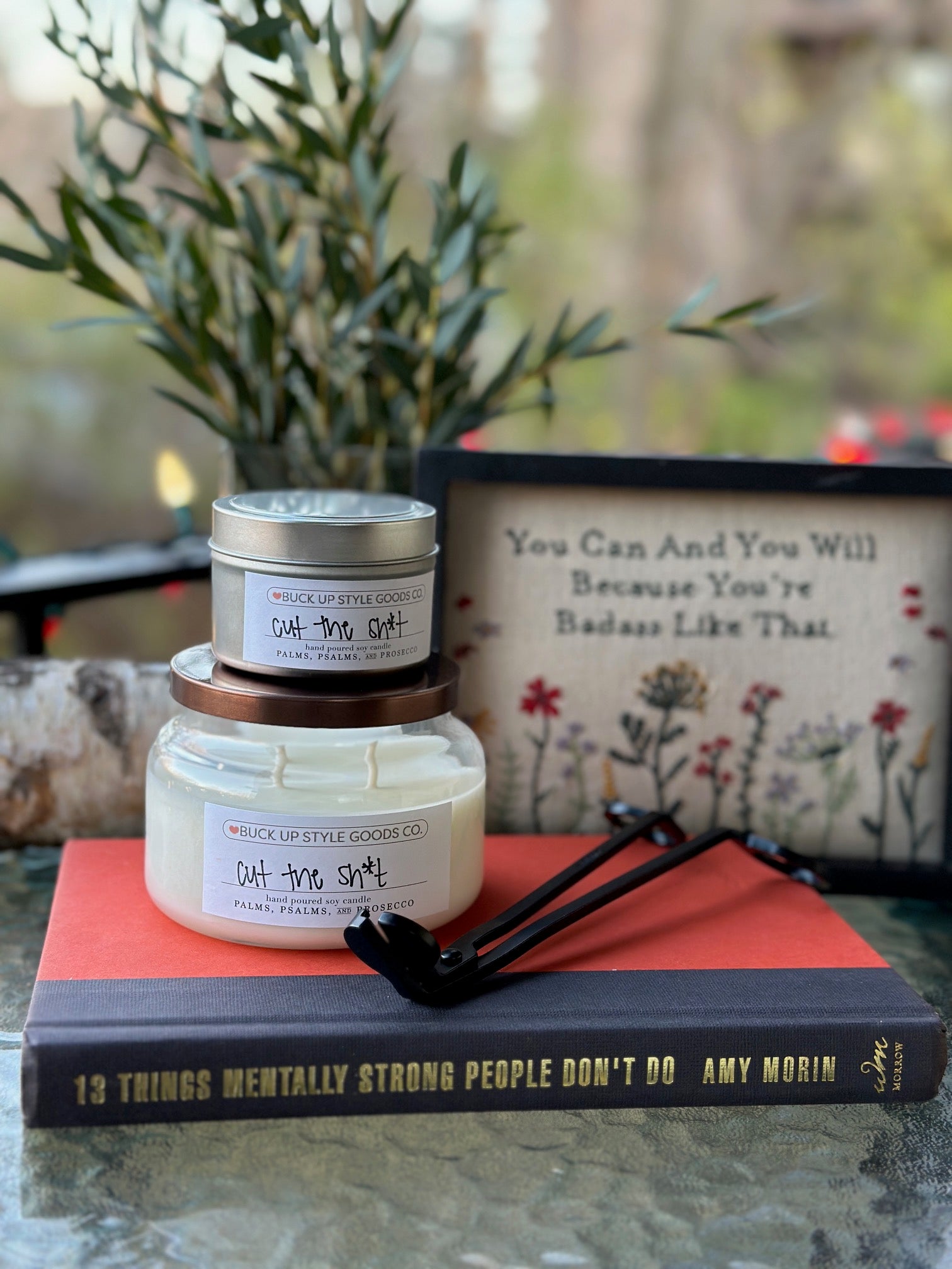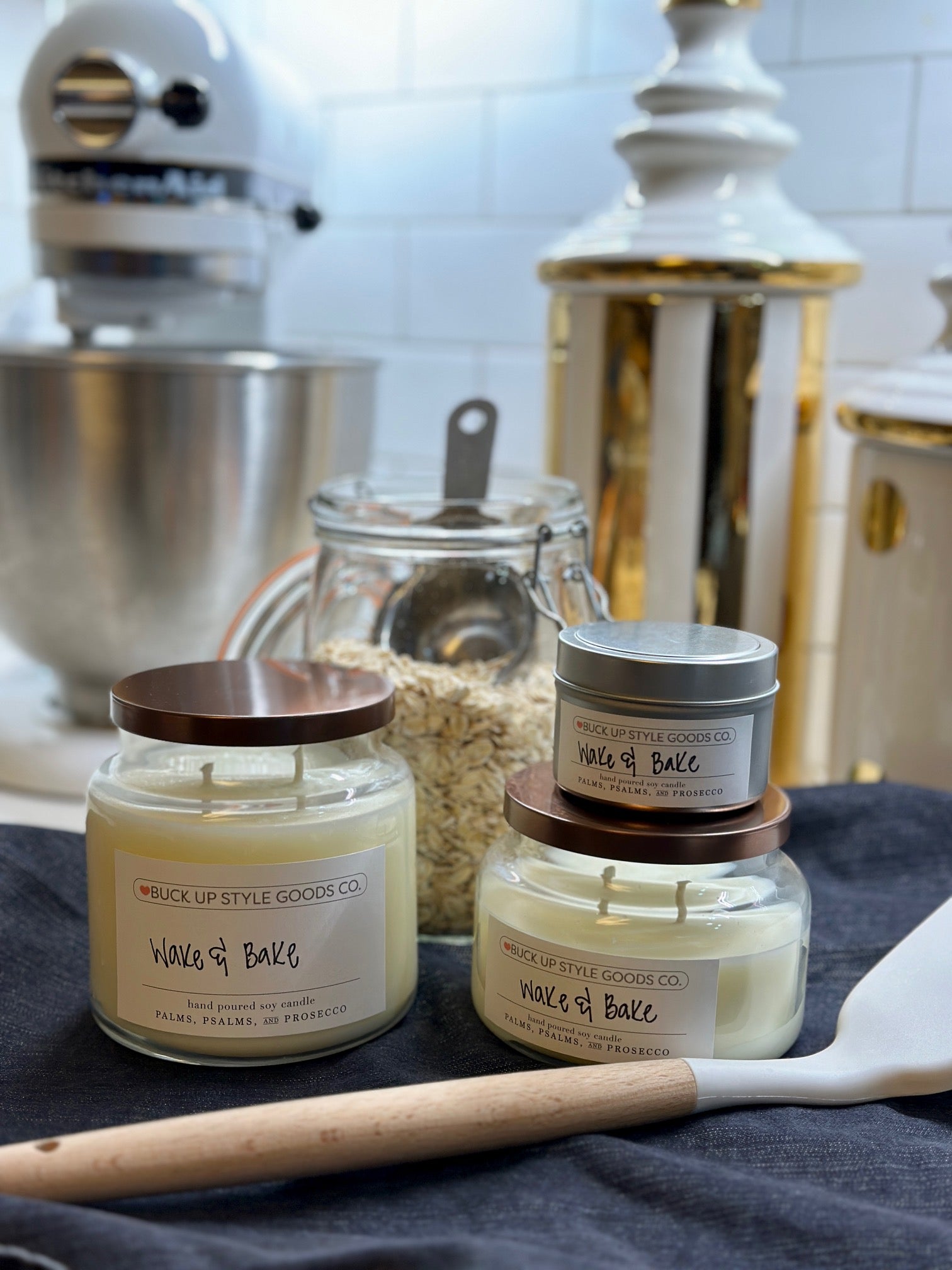 Expertly crafted by our local candle magician, Palms, Psalms & Prosecco. We've selected and custom labeled scents that give-off the Buck Up Style vibe.